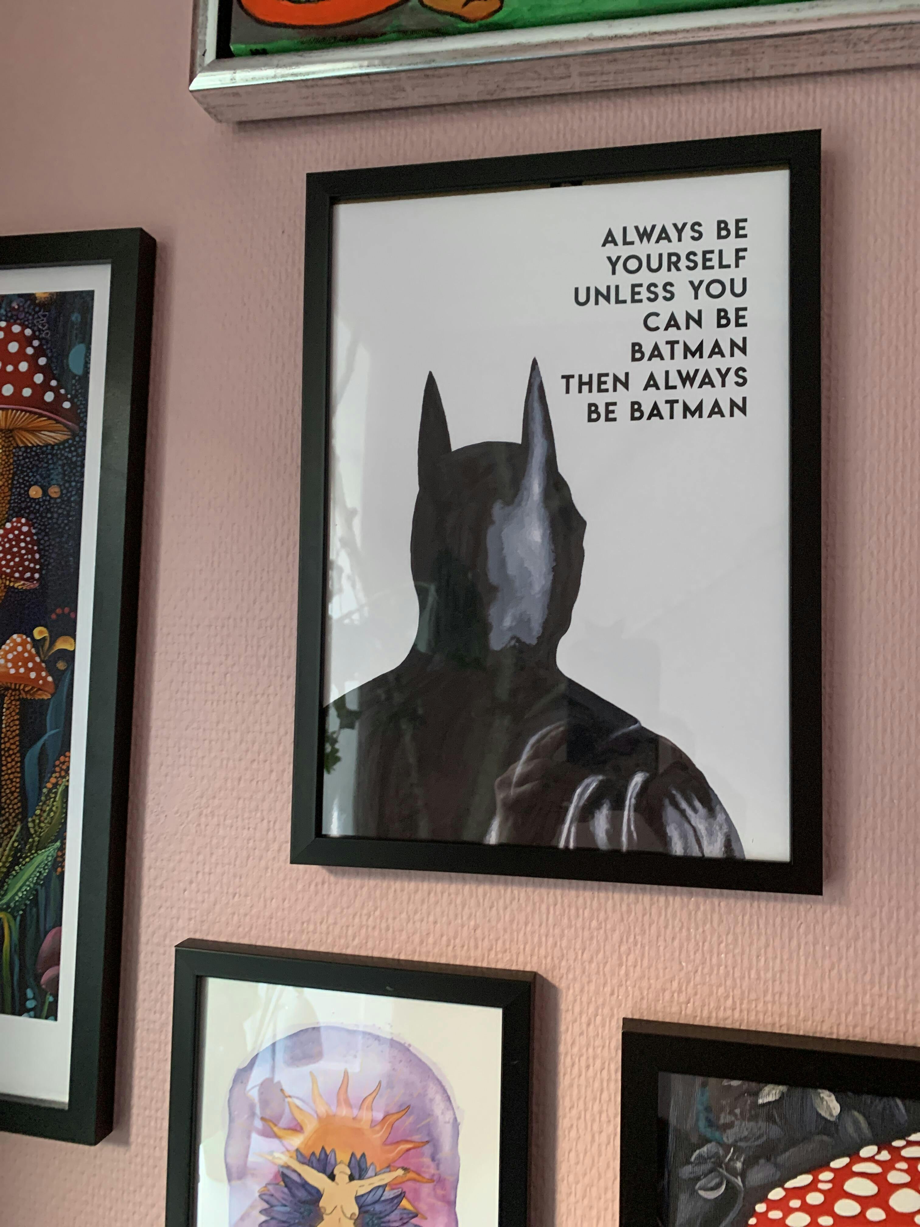 Striking modern design brings a bold touch to any living space, featuring the unmistakable silhouette of Batman in deep monochrome tones. The playful yet empowering message, “Always be yourself unless you can be Batman, then always be Batman,” offers daily inspiration. Ideal for contemporary interiors, this art poster makes a thoughtful gift and an engaging statement piece for home or office décor.